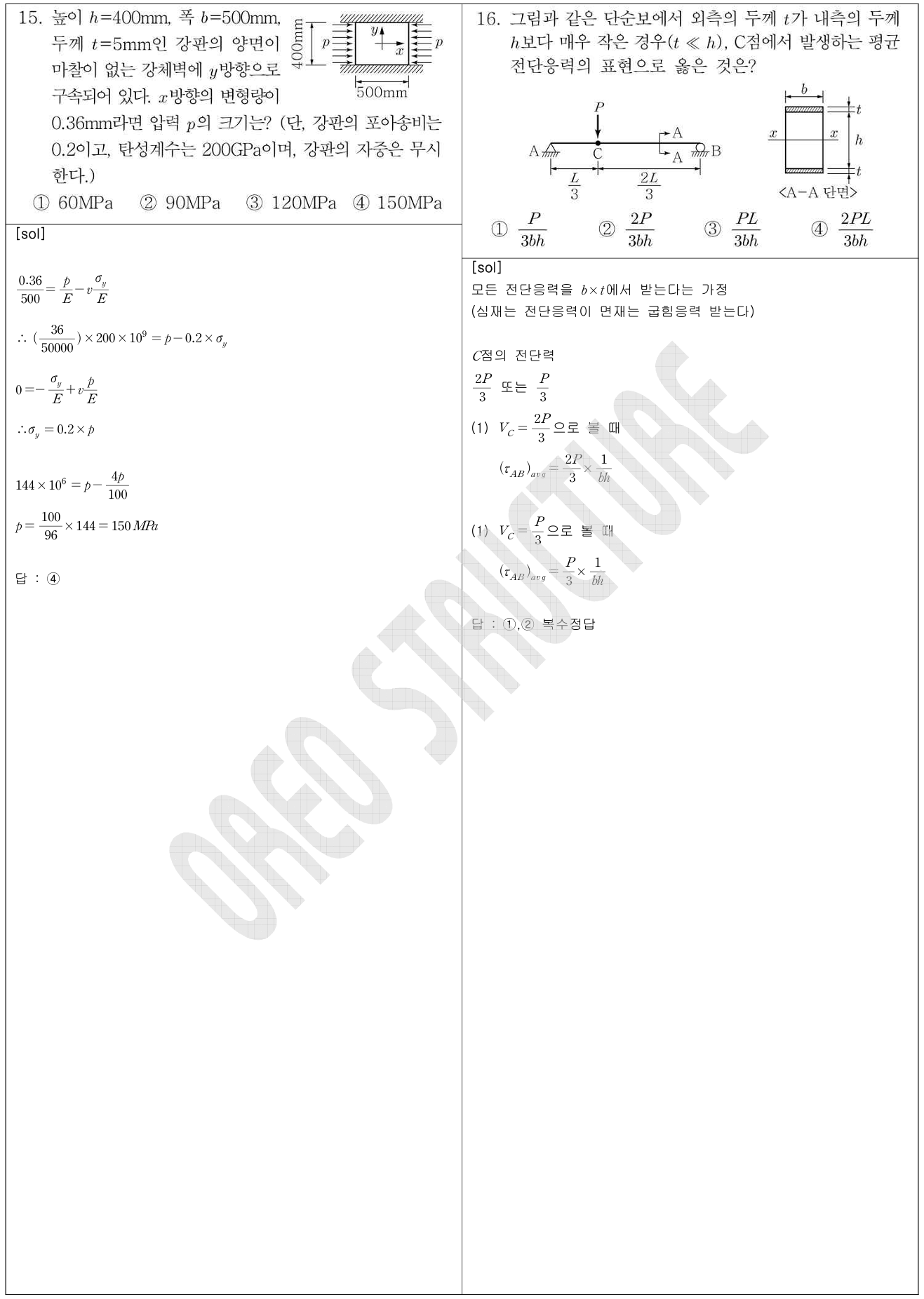 - 16 (심재가 모두 전단응력을 받는다는 가정사항을 알고 있어야 쉽게 접근 가능하나, 문제가 잘못 출제된 것 : 복수정답)