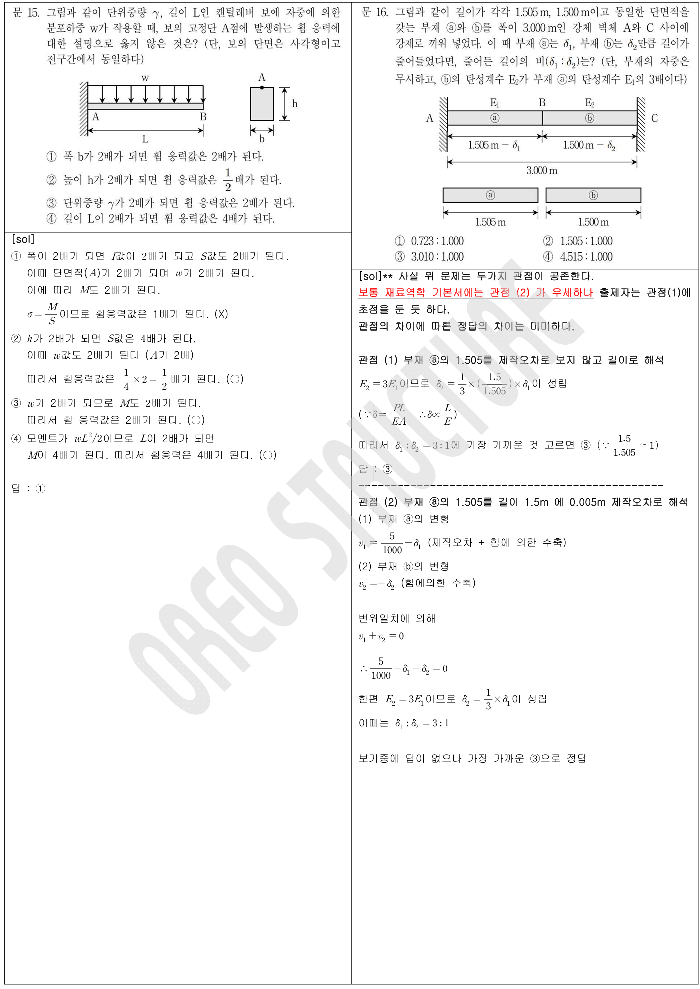 특히 16번 문항의 경우, 제작 오차를 바라보는 두 가지 관점에 대해 풀이 과정에서 모두 언급해 두었습니다. 재료역학 교재의 관련 예제들을 함께 참고해 보시면, 각각의 관점이 의미하는 바가 보다 명확하게 와닿으실 것입니다. 두 관점은 해석의 출발점이 약간 다를 뿐, 부재 길이에 따른 제작 오차 비율이 충분히 작아질수록 동일한 결과로 수렴하게 됩니다. 실제 시험에서는 어떤 관점이 출제 의도에 담길지 알 수 없기 때문에, 두 가지 모두 알고 계시는 것이 안전한 전략이라고 생각합니다.
