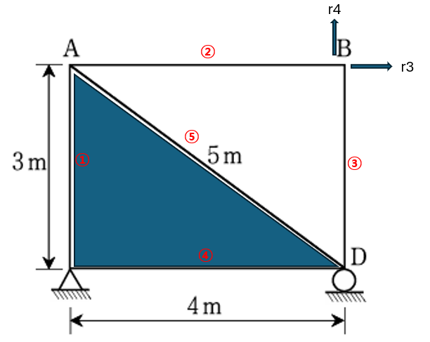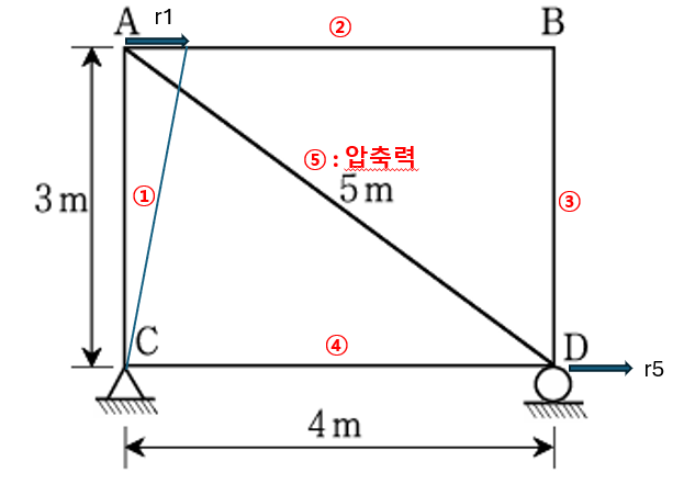 r1 만 존재 할 경우 ⑤ 번 부재의 부재에 압축 변형이 생깁니다.