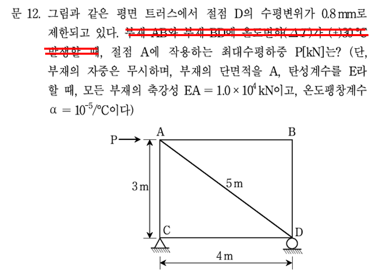 문제에서 부재의 온도 변화 변화량, 즉, local DOF에 따른 전 구조물의 DOF- Global DOF를 살펴볼때, 지점 D의 움직임에는 온도가 어떠한 영향을 주지 않으므로 과감히 온도에 관련된 문구를 삭제할 수 있습니다. 단순히 D가 수평으로 0.8mm만큼 움직일 때, 하중 P의 최대 값을 구하면 됩니다.