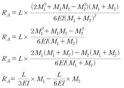위 구조물의 경우 모멘트는 M1에서 -M2까지 선형적으로 변합니다. 이에 따른 곡률 (M/EI) 는 다음과 같이 나타낼 수 있습니다.